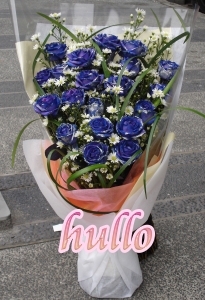 1束,花材:藍玫瑰20朵、白孔雀